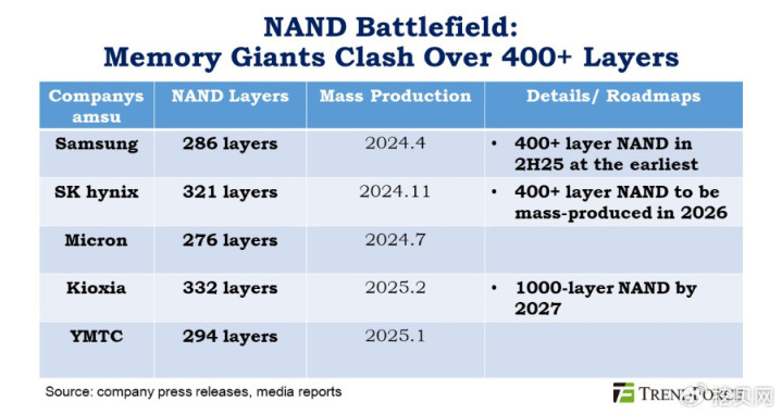 但目前,量产的NAND闪存的堆叠层数都在300层左右。其中,海力士、三星当前量产的堆叠层数最高的产品堆叠层数分别为286层、321层。